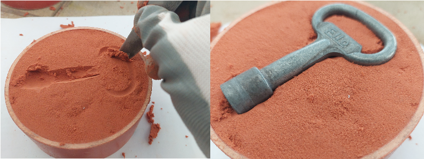 - Přes síto prosejeme formovací směs do výšky 25-50 mm a lehce prsty upěchujeme. Zbytek formy již vyplníme nepřesetou směsí a upěchujeme. Vršek formy seřízneme pevným pravítkem do roviny.